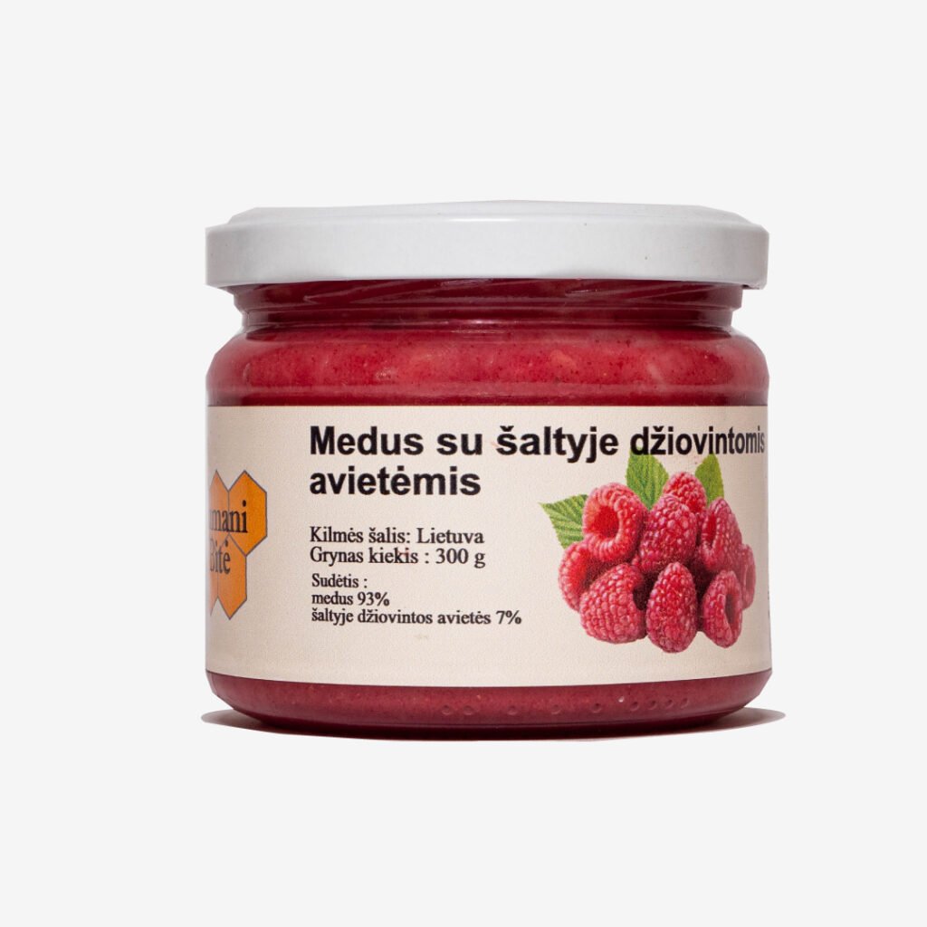 Natūralus medus be jokių dirbtinių priedų, papildytas šaltyje džiovintomis avietėmis
