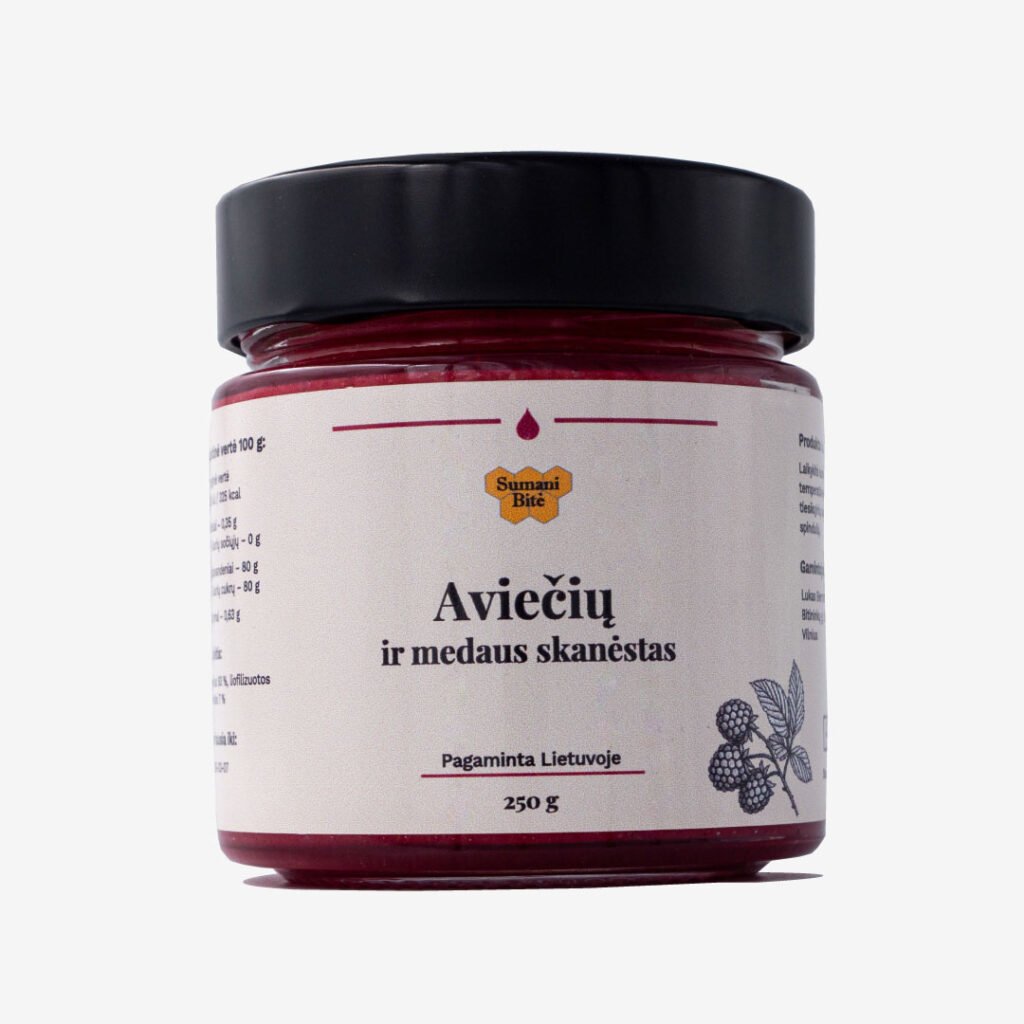Natūralus medus be jokių dirbtinių priedų, papildytas šaltyje džiovintomis avietėmis