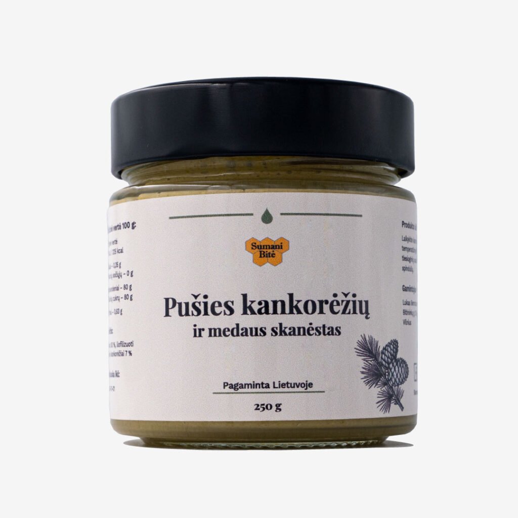 Džiovinti kankorėžiai sumalami ir maišomi su lietuvišku medumi. Dedame net 7 % kankorėžių – dėl skonio ir naudos.